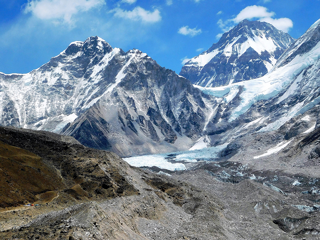 Po kosilu smo tako odšli proti cilju. Do kraja, kjer se maja zberejo vsi navdušenci, ki bi se radi povzpeli na vrh Everesta. Do tja smo hodili približno tri ure. Na poti je bilo veliko kamenja in ledenik Khumbu nas je ves čas spremljal. Če še niste vedeli, je bazni tabor Everest (ali Everest Base Camp) v bistvu kup kamenja in zastav. In v mesecu maju so tu tudi šotori tistih, ki se odpravijo na vrh gore.