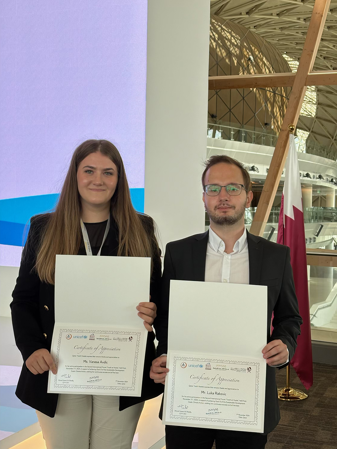 Sva Vanesa in Luka, slovenska predstavnika na mednarodnem forumu v Dohi, ki je združil mlade iz desetih držav z namenom izmenjave znanja, idej in dobrih praks. Na forumu sva predstavljala Slovenijo ter njene trajnostne pobude, hkrati pa sva imela priložnost od blizu spoznati Katar, državo, ki v svetu slovi po svojem hitrem razvoju, bogastvu in gostoljubju. Obisk ni bil le strokovna izkušnja, temveč tudi priložnost za osebno rast, kulturno raziskovanje in odkrivanje, kako se ta dinamična država sooča z izzivi sodobnega časa.